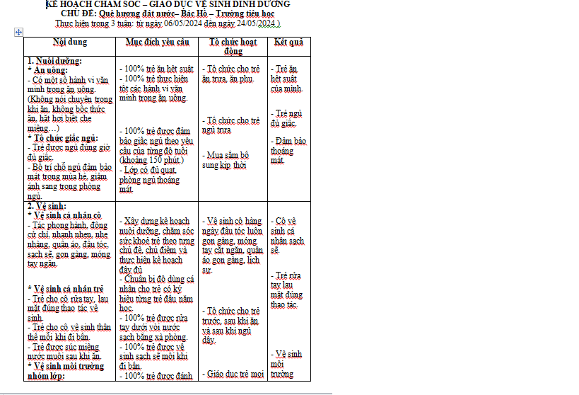 KẾ HOẠCH CHĂM SÓC GIÁO DỤC VỆ SINH DINH DƯỠNG VÀ KẾ HOẠCH CHỦ ĐIỂM QUÊ HƯƠNG LỚN D HOÀI TỪ NGÀY 5.5-23.5