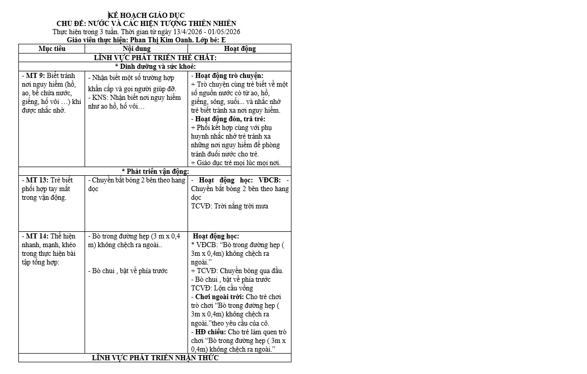 mục tiêu kế hoạch giáo dục chủ đề nước hiện tượng nhiên BÉ D